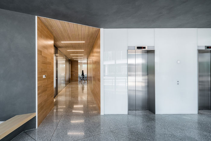 公共走道設(shè)計:用現(xiàn)代感強的深灰色作為主色調(diào),而在會議室相對私密的走道,以木質(zhì)材質(zhì)為主,形成了空間的包裹感受,對不同區(qū)域空間進行區(qū)分。