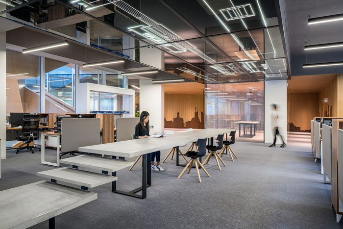 在開敞辦公區(qū)域設(shè)計中,設(shè)計將空間所必需的設(shè)備管線、橋架等隱藏在居中的吊頂內(nèi),吊頂下空間相對較低的位置,被設(shè)置為茶歇和交流區(qū)。在空間設(shè)計中以城市天際線為設(shè)計元素,同時工業(yè)化的設(shè)計,給了企業(yè)不一樣的特性。