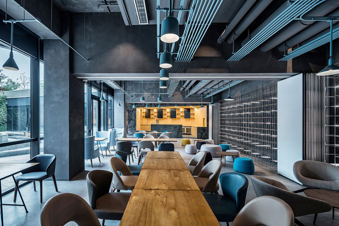 多功能咖啡館設(shè)計:是地下空間重點區(qū)域,作為員工休息放松的場所,這里定位為年輕、包容、靈活、互動,在休閑咖啡外還集合沙龍、課堂、派對為一體的集合咖啡館。