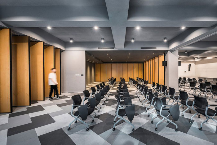 多功能廳設(shè)計:一面墻設(shè)置為白色烤漆玻璃和投影面,另外三個面和中央,通過可旋轉(zhuǎn)和平移的隔斷設(shè)置,可以根據(jù)使用行為,劃分出不同的空間狀態(tài)。