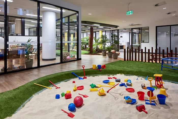 【早教中心裝修廳設(shè)計(jì)】心綠植:現(xiàn)在的小朋友已經(jīng)鮮少能夠見到泥土地了,設(shè)計(jì)師希望通過綠植室內(nèi)的栽植,讓孩子回歸自然、回歸先天,讓孩子在這樣的空間中感受到自然的魅力。
