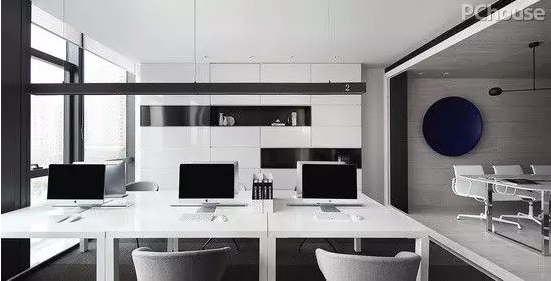 而是先將大的辦公室板房空間通過不同材質、顏色、燈光作解構,將材質依照其各自肌理條件,觀察在燈光下呈現(xiàn)出的顏色和狀態(tài),以此為設計依據,才開始考慮圖上的設計作業(yè)。在拆分然后歸納材質和色調變化之后,發(fā)現(xiàn)整個空間在色調的構成上呈現(xiàn)的是較大比例,不同亮度和存在狀態(tài)的灰和白的主調。