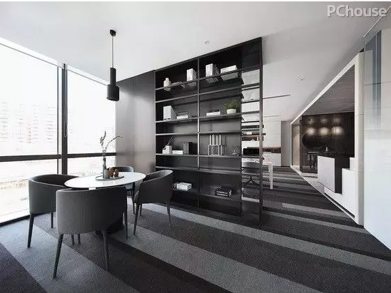 白色的調子是整個重新建構的空間中保持穩(wěn)定的部分,而由定制水泥板、木質造型的體塊、灰色玻璃、地毯、家私形成的不同色調,不同質感的灰色,就成了整個空間中最活潑的元素,與白色相得益彰。