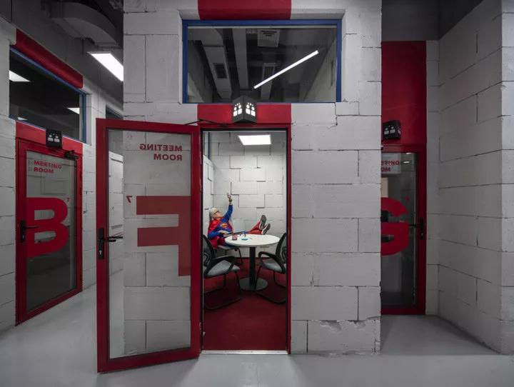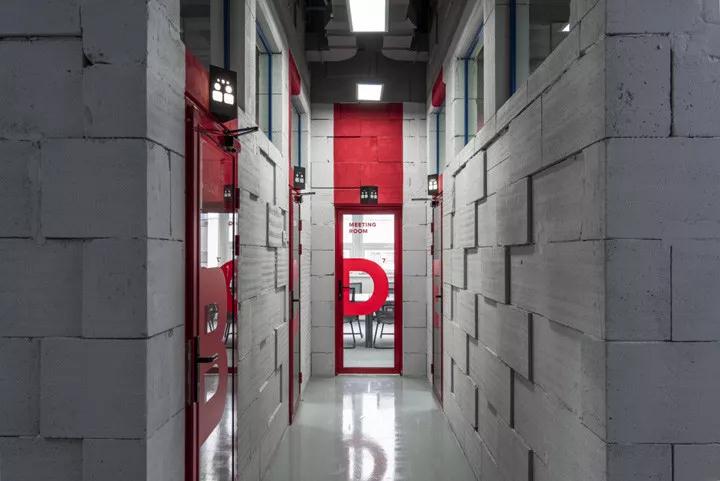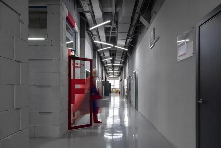 灰色環(huán)氧樹脂地坪漆、灰色的水泥墻面、灰色噴涂的頂面構(gòu)造、以及灰色砌塊墻體,整個空間統(tǒng)一在寧靜的淺灰色調(diào)中,以紅色企業(yè)色來點(diǎn)亮一個個空間,賦予每個區(qū)域各自不同的劇情故事。