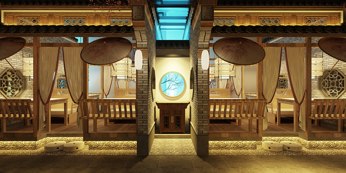 將油紙傘設立在餐廳最顯而易見的地方,旨在傳遞一種情愫:以傘之名致敬婉約歷史,令中國風得以具象體現(xiàn)的同時,也讓‘偷得浮生半日閑’的愜意彌漫至整個空間。